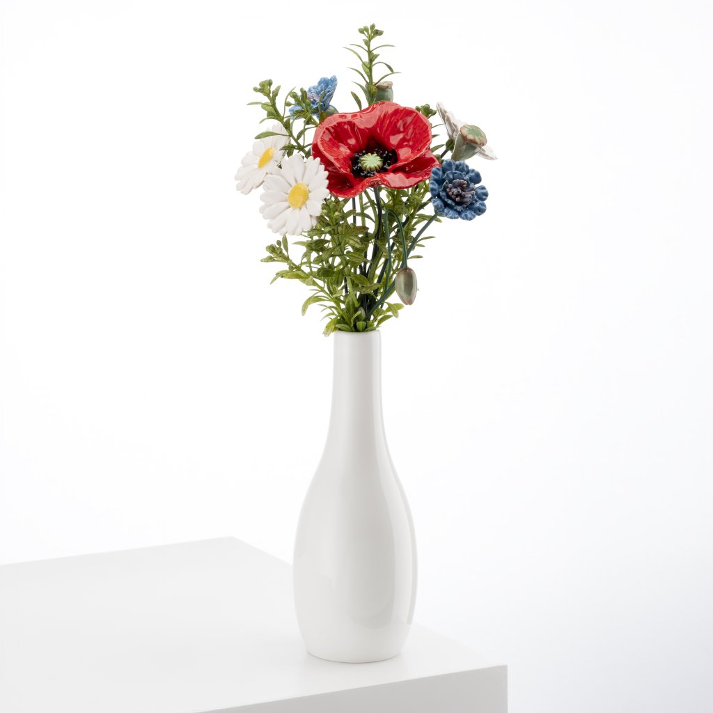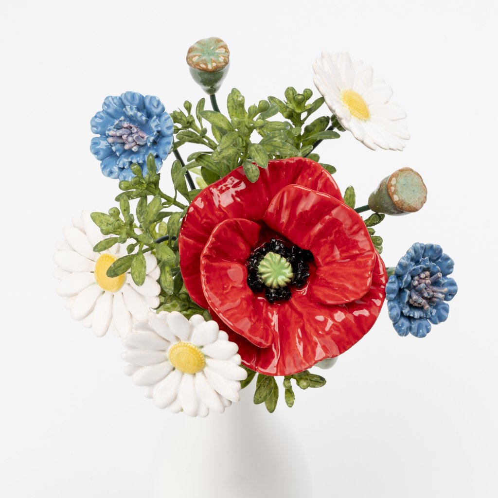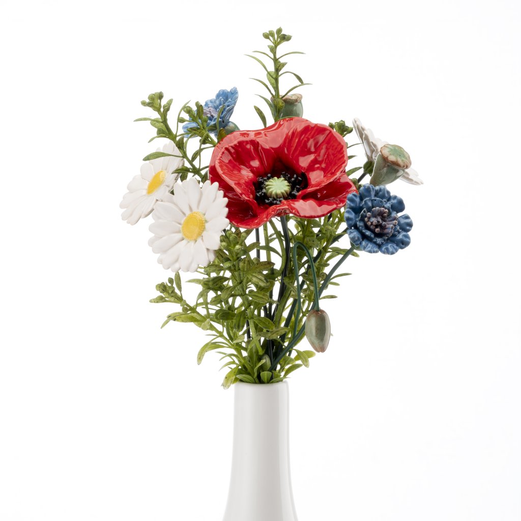 Keramická kytice inspirovaná krásou divoké přírody kombinuje výrazný květ červeného vlčího máku, makového poupěte, jemné kopretiny, modré chrpy a malé makovice do harmonického celku. Každý květ je ručně tvarován a glazován s péčí, která podtrhuje jeho přirozený půvab. Tato kytice přinese do vašeho interiéru trvalý kousek léta a svěžího venkovského kouzla.